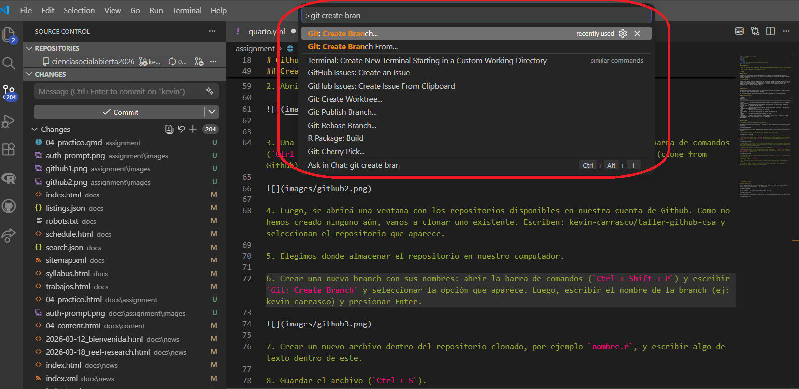 Ctrl + Shift + P) y escribirGit: Create Branchy seleccionar la opción que aparece. Luego, escribir el nombre de la branch (ej: kevin-carrasco) y presionar Enter.