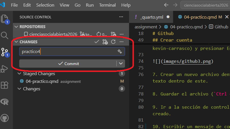 tarea.qmdde sus compañer-s y agregue algo de texto. Después, hacer commit y push de los cambios para que quien administra el repositorio pueda descargar (pull) los nuevos cambios realizados.Descargar los nuevos cambios en sus repositorios locales y verificar que el documento