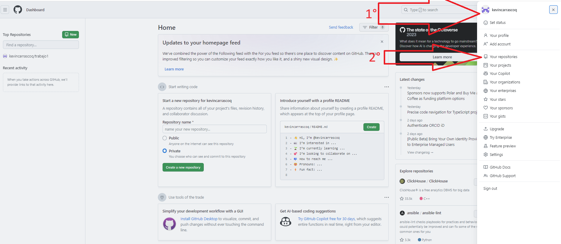 - En la página principal de GitHub hacer click en el ícono de usuario de la esquina superior derecha y luego ir a Tus repositorios