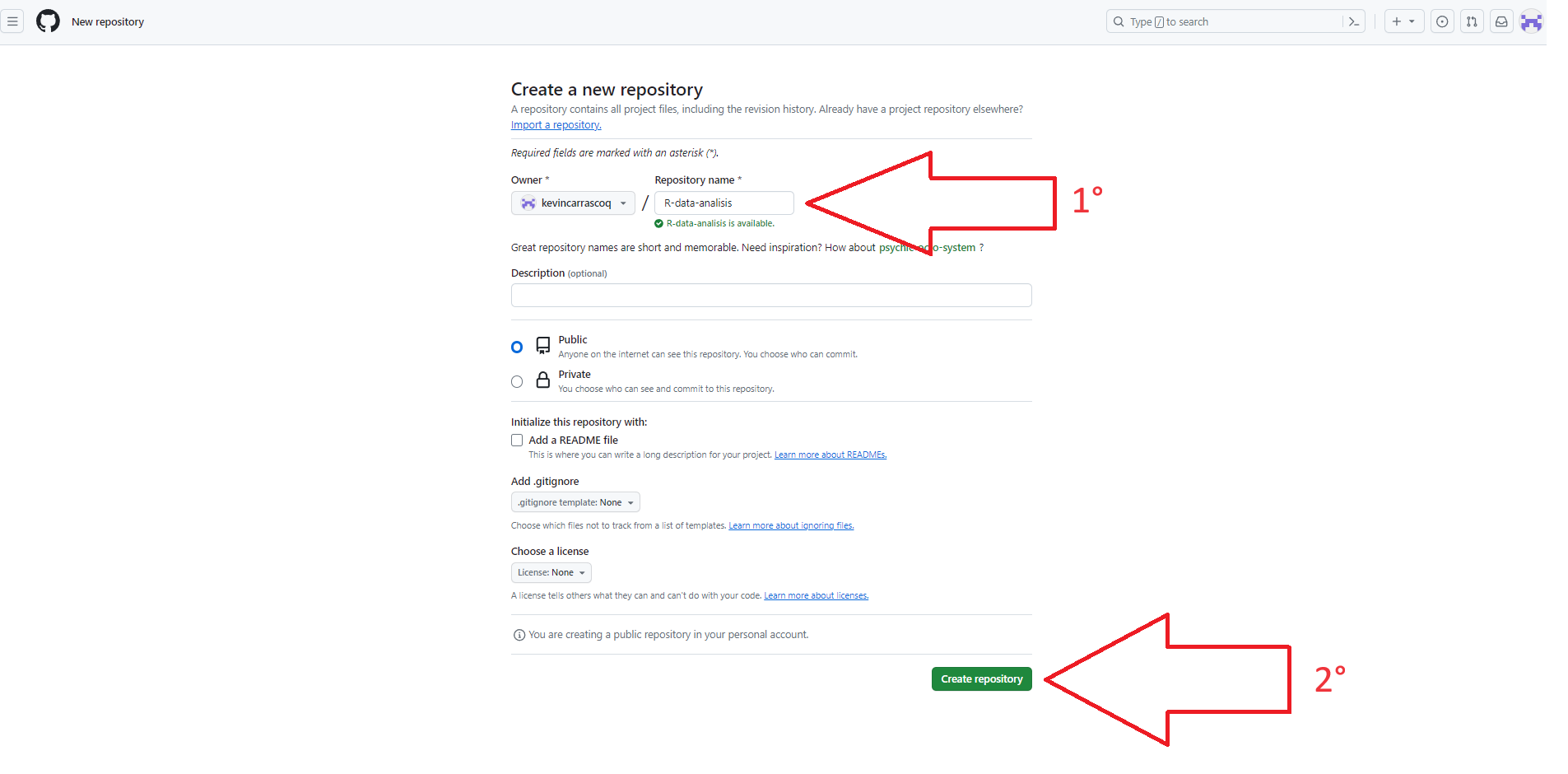 - Luego le ponemos un nombre a nuestro repositorio, evitando siempre espacios, ñ y tíldes, y apretamos Crear repositorio