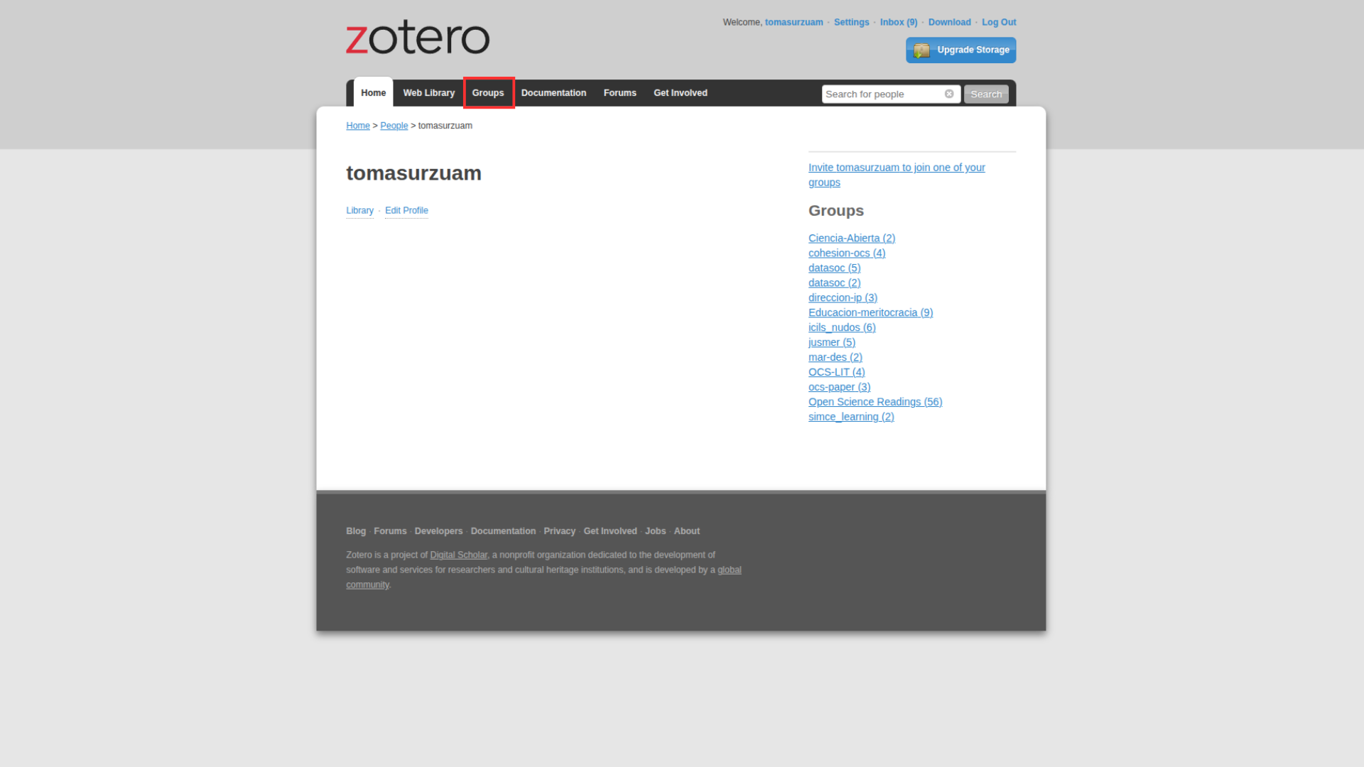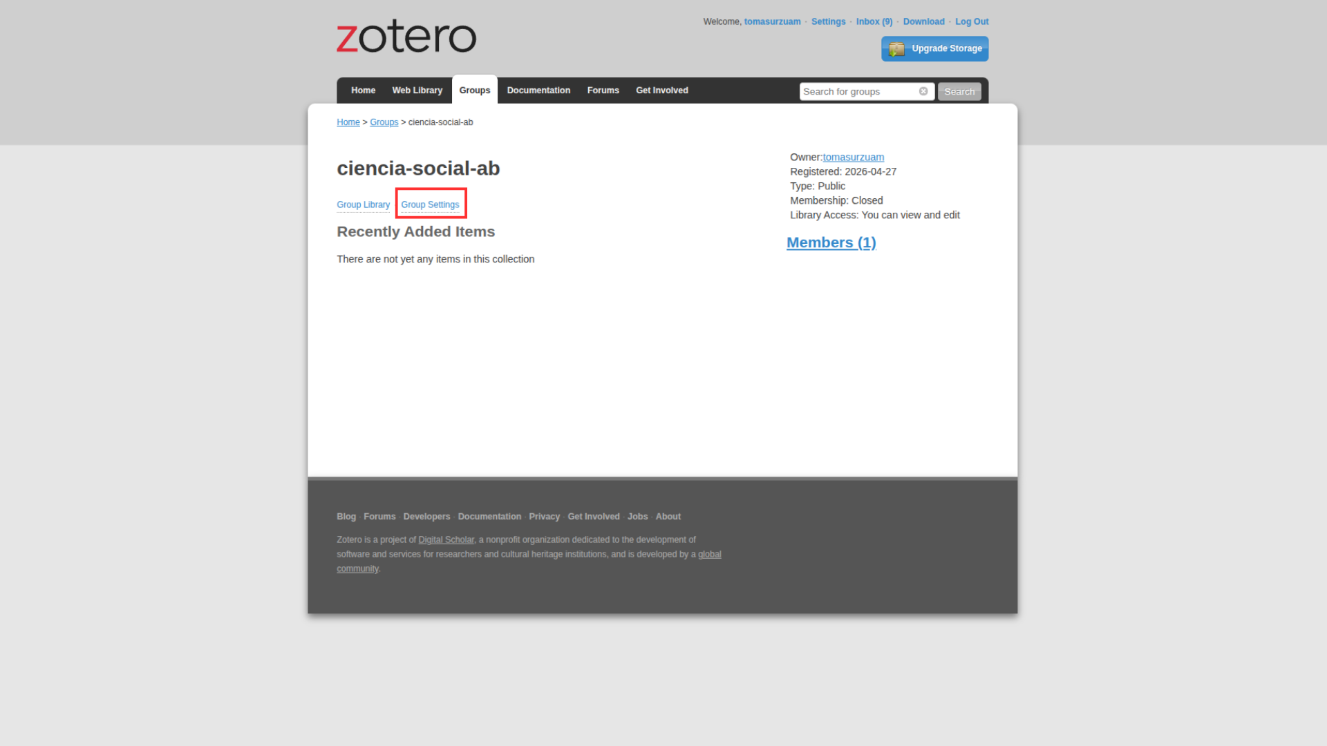 Ahora sólo falta invitar a las personas con quienes utilizarán este espacio. En la página web de Zotero deben ingresar en la biblioteca ya creada, clickear “Group Settings” -> “Members Settings” -> “Send more invitations” y escribir el email o el username de quienes quieran añadir.