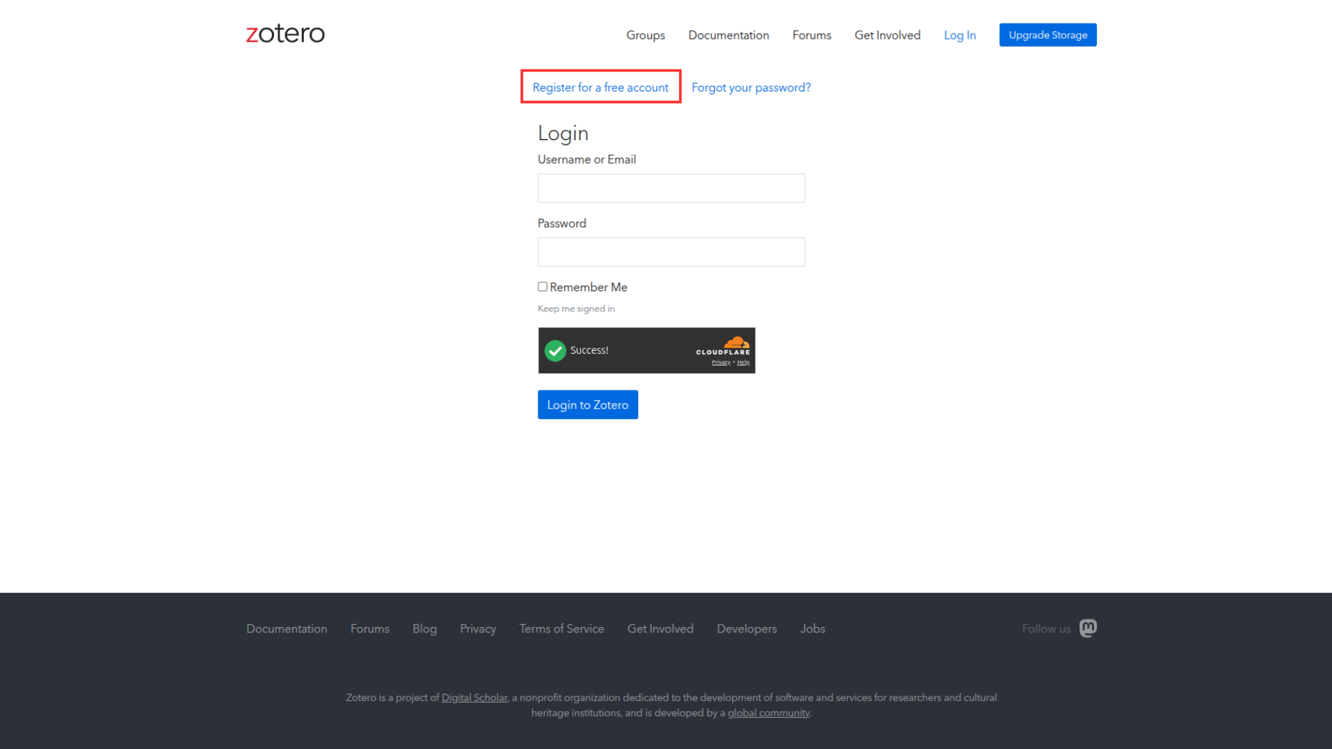 Si ya tenemos una cuenta en Zotero, escribimos nuestros datos e ingresamos. Si no tenemos una cuenta, clickeamos en el apartado que señala el cuadro rojo en la imagen para crear una cuenta, y luego ingresamos.